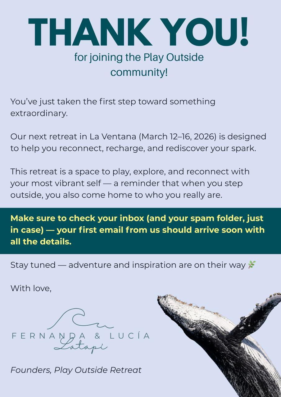 We're Lucía and Fernanda, the founders of Play Outside Retreats. We're not just guides; we're fellow seekers who traded the corporate grind for wetsuits and wonder. We've walked the path from burnout to bliss, and we've crafted this retreat as the experience we desperately needed.Our mission is simple: to hold space for you to play, explore, and reconnect with your most vibrant self.